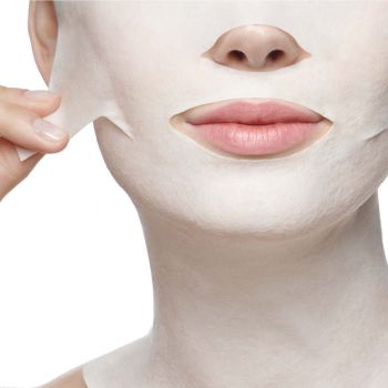 2. Applicera tygmasken på rengjort ansikte och hals, börja i pannan och applicera den därefter runt ögonen.