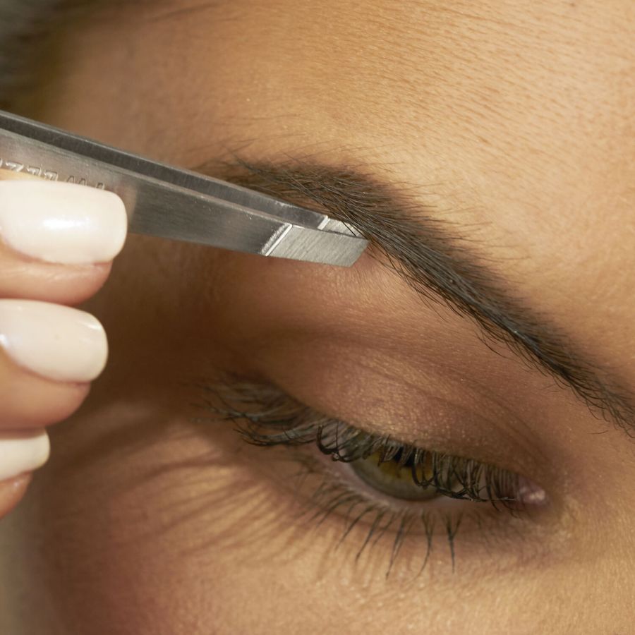 Steg 1: Använd Slant Tweezer för att plocka bort oönskade strån under och över din önskade ögonbrynsform, och använd Point Tweezer för att avlägsna fina eller inåtväxande hårstrån.